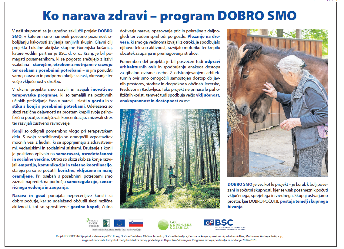Projekt DOBRO SMO se izvaja z namenom pomoči ranljivim skupinam, izboljšanja počutja in kakovosti življenja ter večje vključenosti v družbo. Razvit je bil inovativen terapevtski program spodbujanja dobrega počutja ter gradnje telesnega in duševnega zdravja, ki je namenjen starejšim, otrokom z motnjami v telesnem in duševnem razvoju ter osebam s posebnimi potrebami.