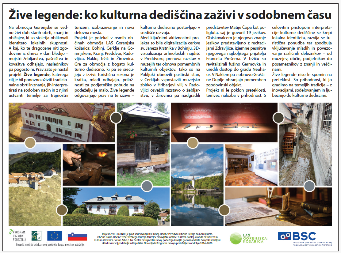 Skozi projekt Žive legende se je nadgradila obstoječa etnološka in kulturna dediščina muzejskih zbirk na področju različnih tradicionalnih obrti in dejavnosti, kot so pašništvo, žebljarstvo, pastirstvo in literarna zgodovina. Potekala so obnovitvena dela na objektih izjemno pomembne kulturne dediščine, od zamenjave kritine na objektu Graščine Duplje v občini Naklo in revitalizacije Fužine Germovka do obnove poti in stopnišč na gradu Neuhaus v občini Tržič.